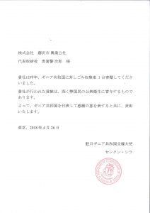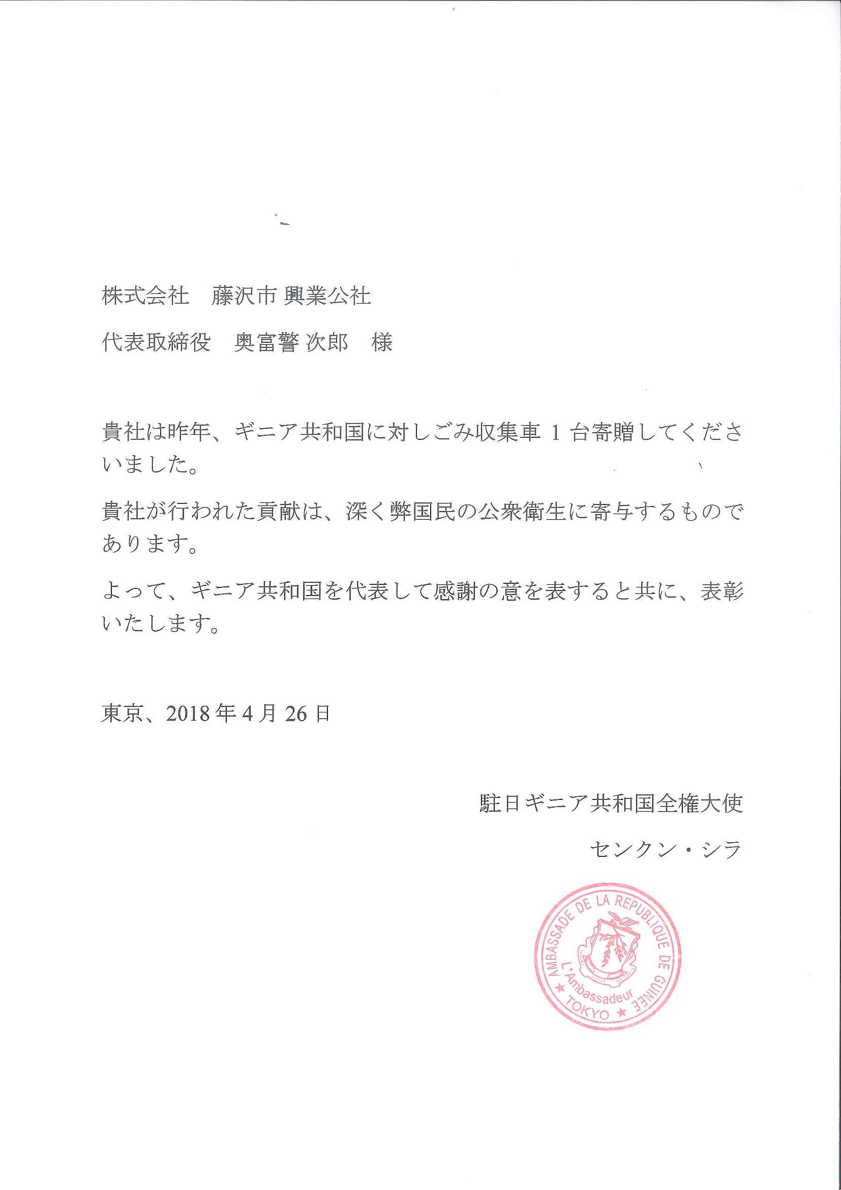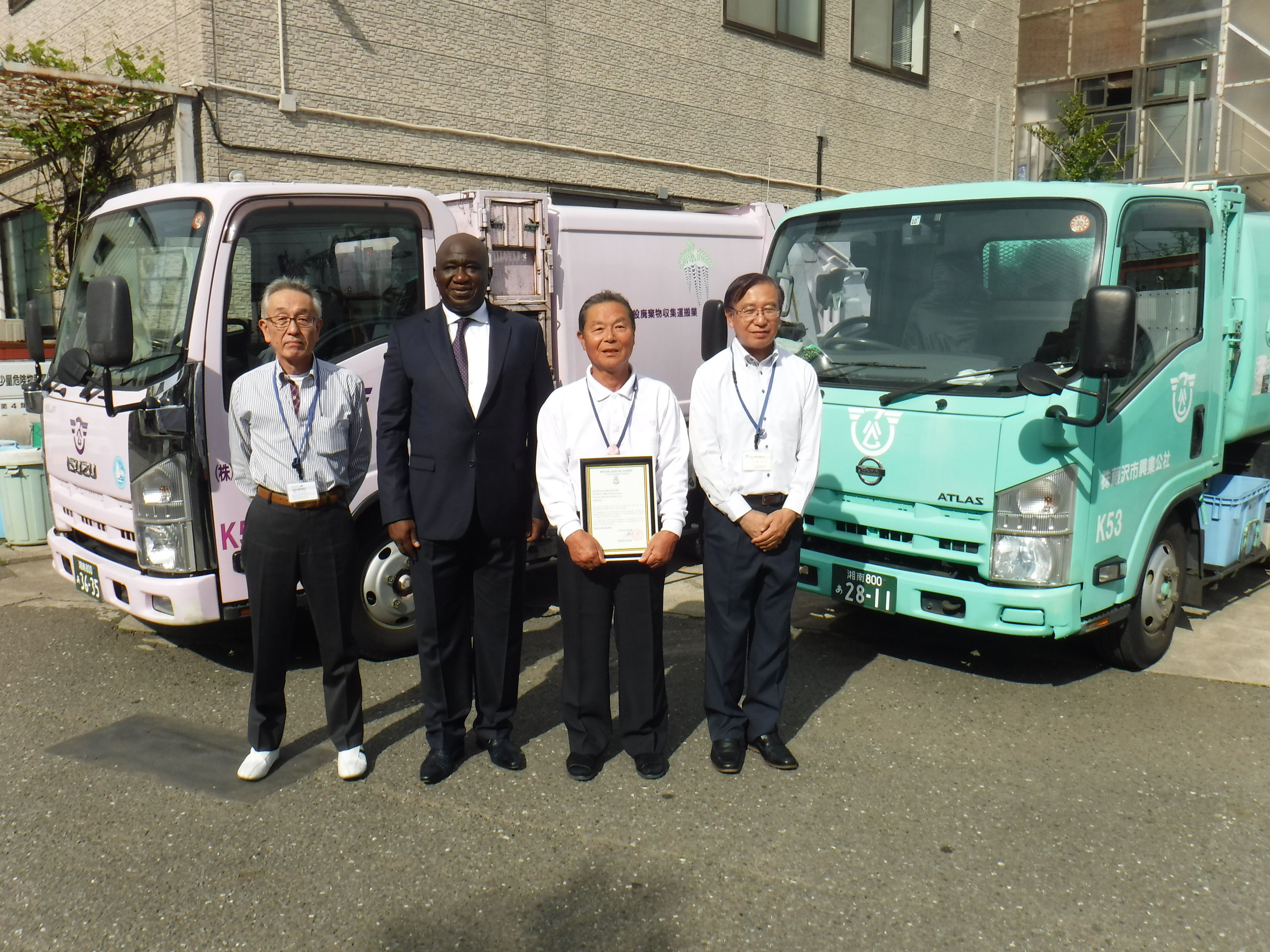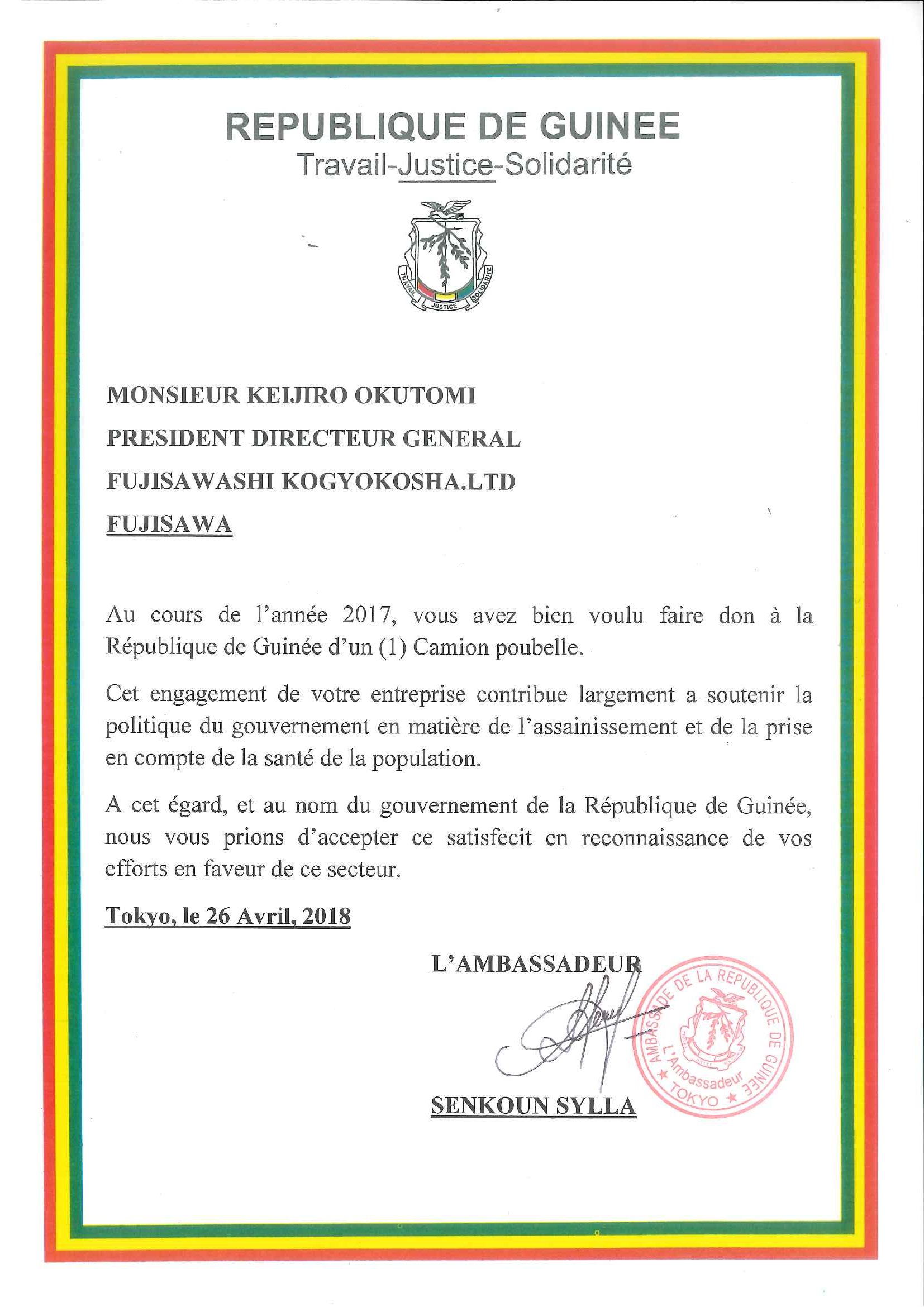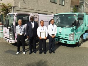 昨年にゴミ収集車を1台ギニア共和国に寄付をさせて頂いたことによる表彰です。