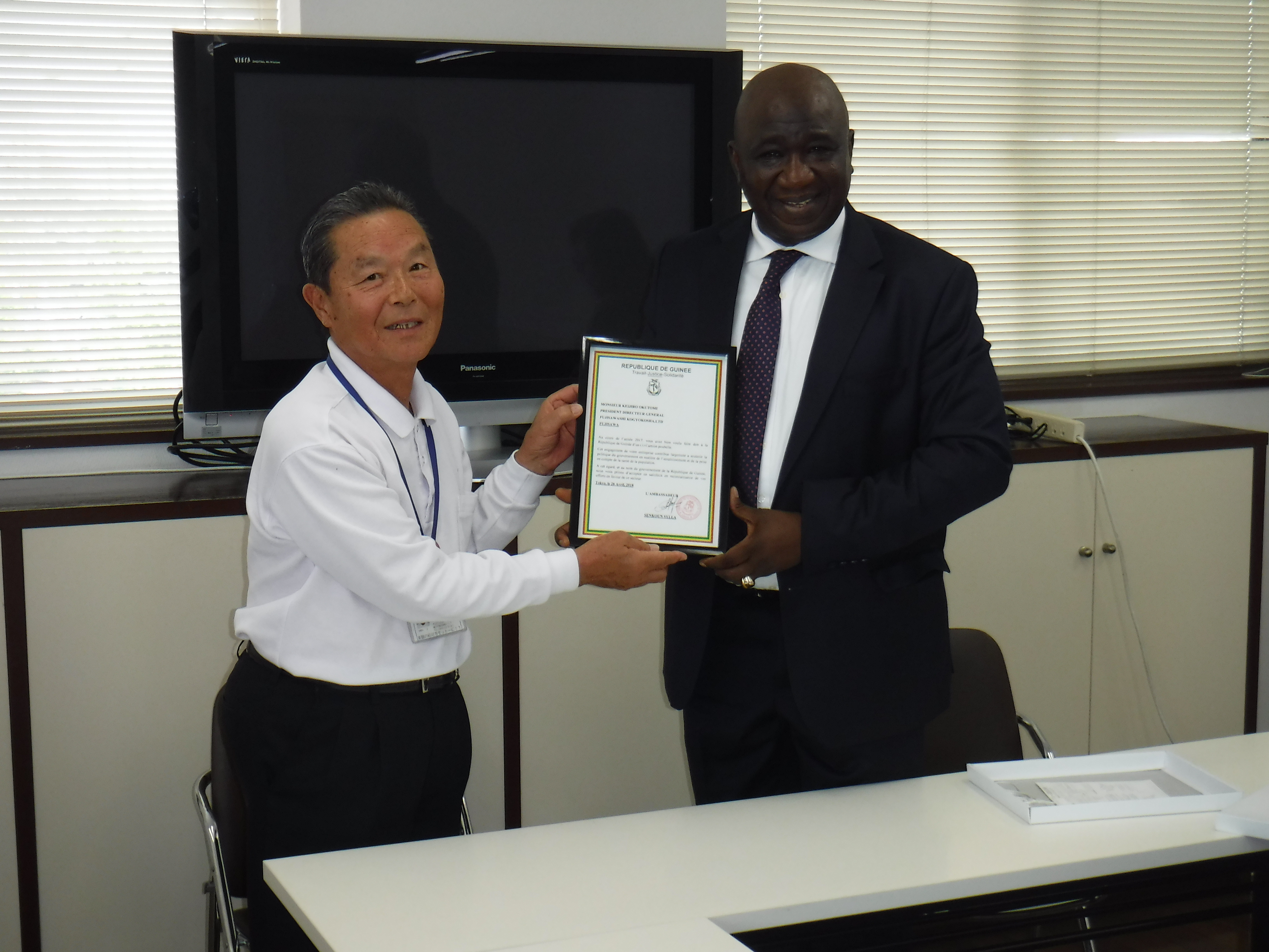 本日、ギニア共和国の駐日大使がお越しになり、表彰して頂きました。